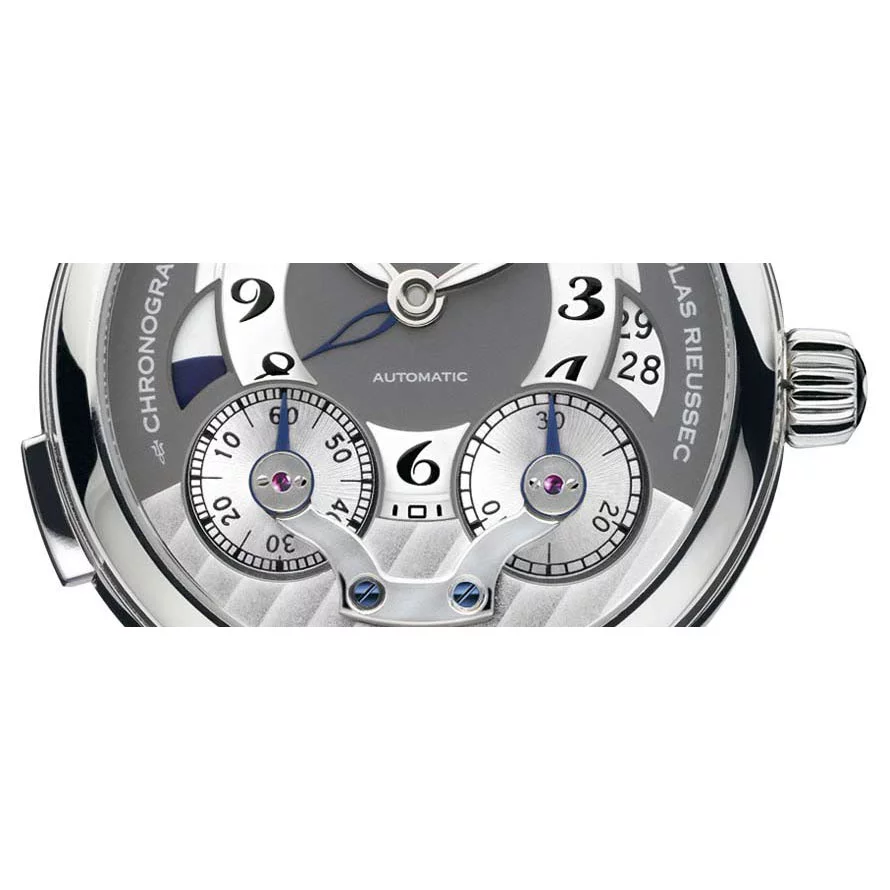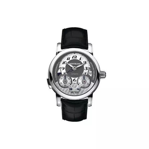 43 mm watch with stainless steel case, Montblanc Calibre MB R200, monopusher chronograph with automatic winding, anthracite-coloured dial with applique hour circle, date display, second time zone with day/night display, chronograph counters with rotating discs.